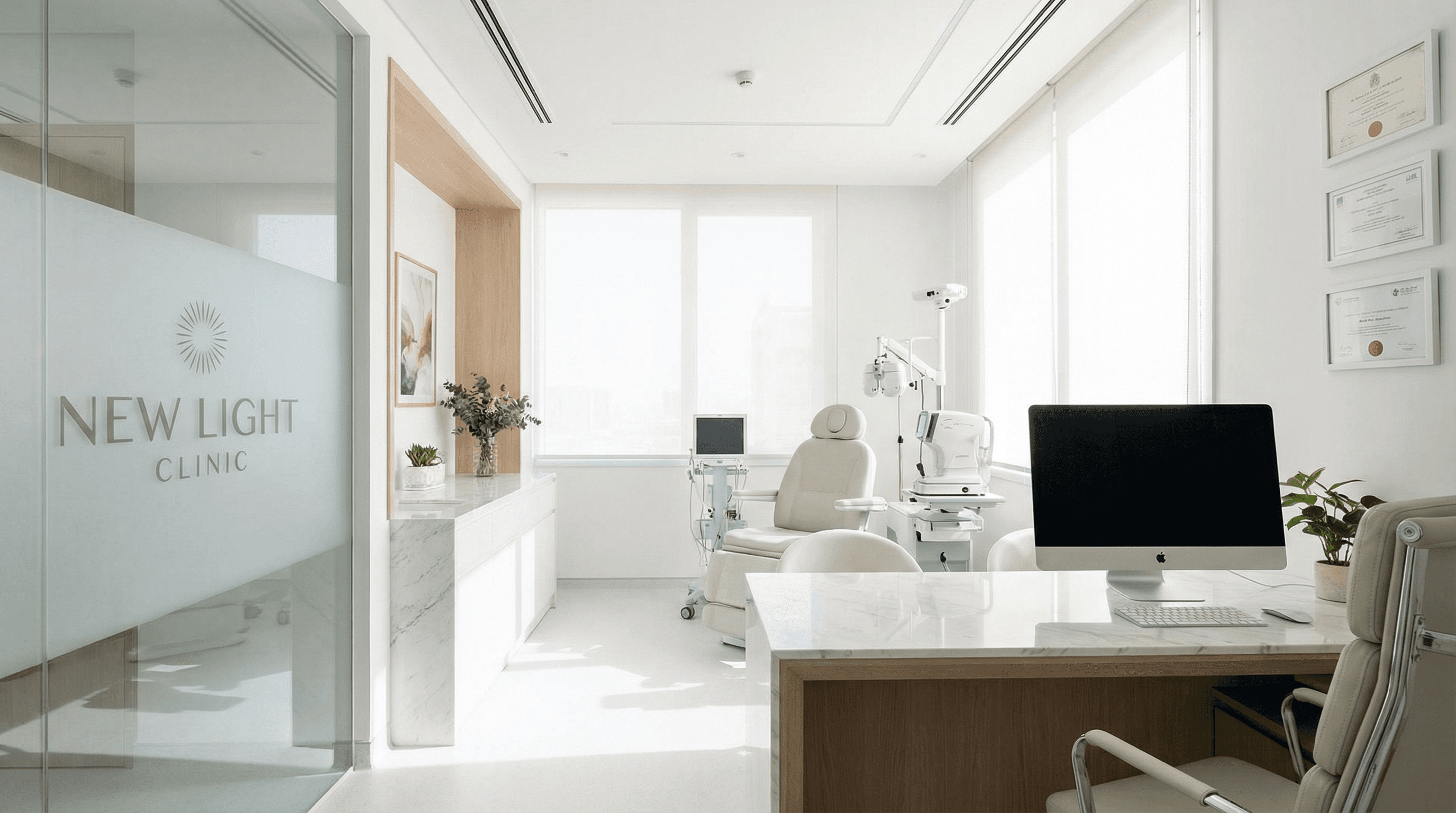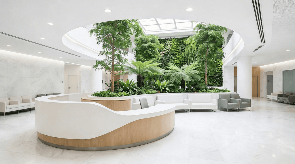 화이트·그레이 톤의 절제된 컬러와 직선적인 라인으로 청결함과 신뢰감을 구축합니다. 대리석 질감의 고급 마감재와 심플한 금속 디테일, 명료한 조명 설계로 전문 의료기관으로서의 권위를 표현합니다. 불필요한 장식을 배제한 미니멀리즘 기반의 공간 구성으로 정돈되고 체계적인 이미지를 전달하며, 환자에게 안정적인 진료 환경을 제공합니다.
